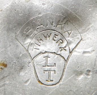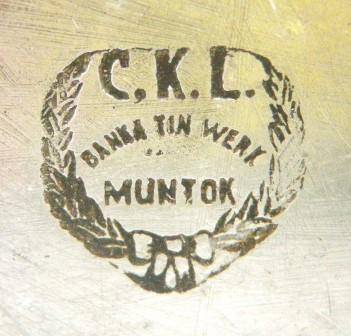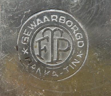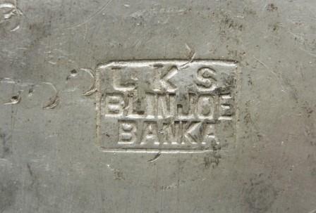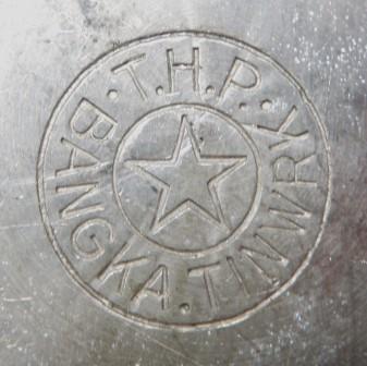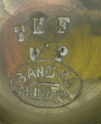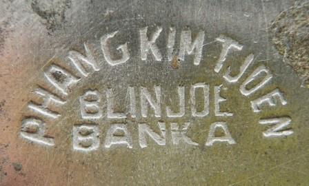 Afbeeldingen Banka tin (Klik op een afbeelding voor vergrote weergave) Merktekens Banka tin Phang Kim Tjoen F.T.P. Banka tinwerk NAM*SIN Toko Boroboedoer T.H.P. L.K.S. Blinjoe Banka Blinjoe Super N.I.F. L.T. C.K.L. Muntok T.T.F. T.H.P. Nam-Sin Soengeliat N.I.F. Chinese tekens T.T.T. & Co. T.H.P. T.K.F. P.P. T.K.F. T.K.F. Banka tin T.K.F. Fo-Sin Bangka B.N.F. Banka tin werk T.K.F tinnen asbak pillendoos 6 hoekige theebus tinnen onderzetters tinnen rijstbakjes ovale tinnen pindabakjes Kop en schotel schenk kannetje gehamerd Ollie of azijn kannetje tinnen schenkkan twee tinnen schenkkannen tinnen theepot Thee servies Vind-ik-leuk Aan het laden...