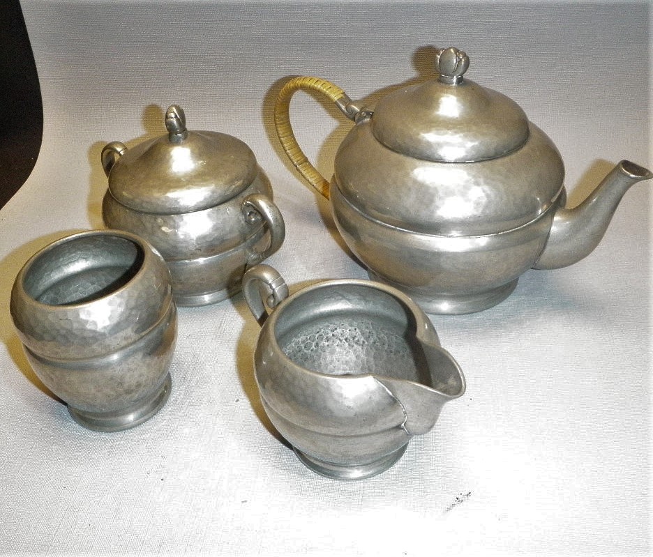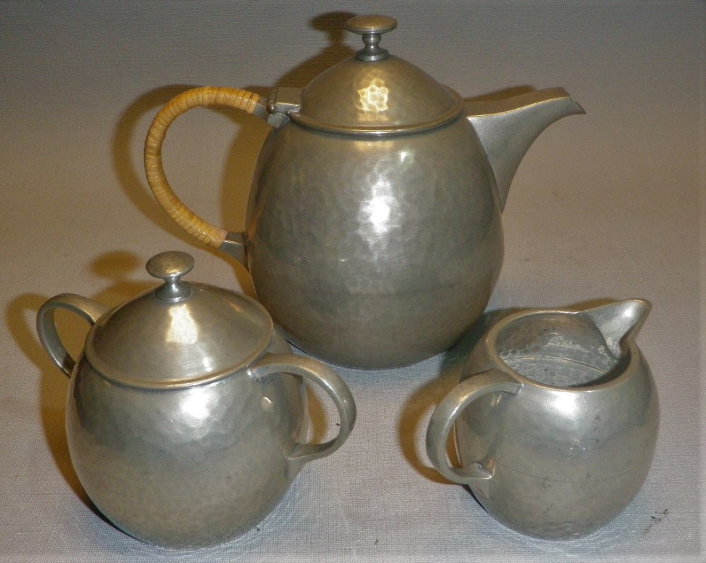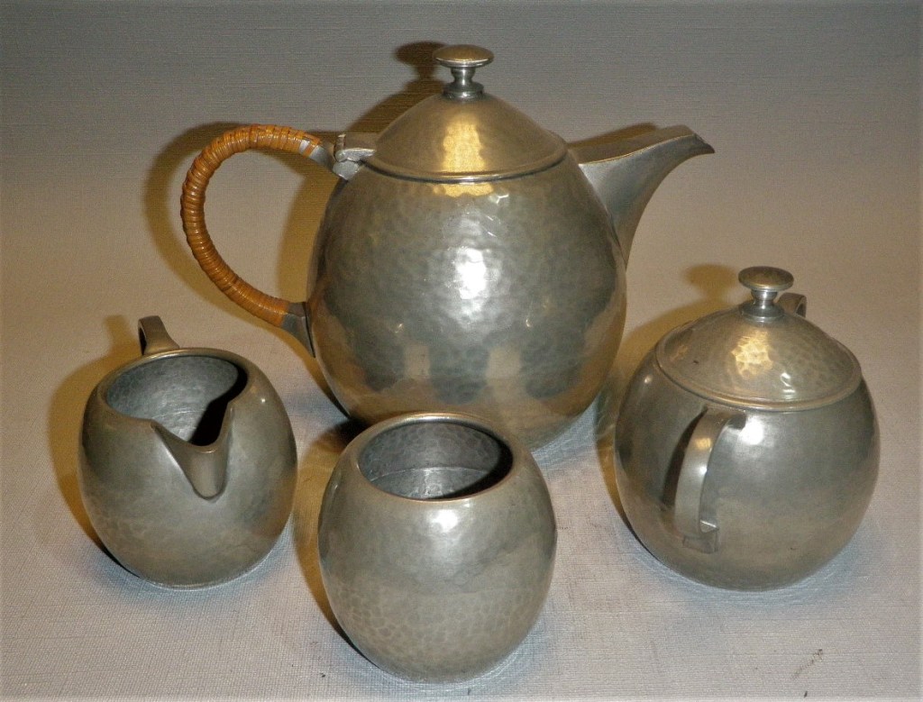 Merkteken Gero tinnen theepot, gehamerd, rotan handvat