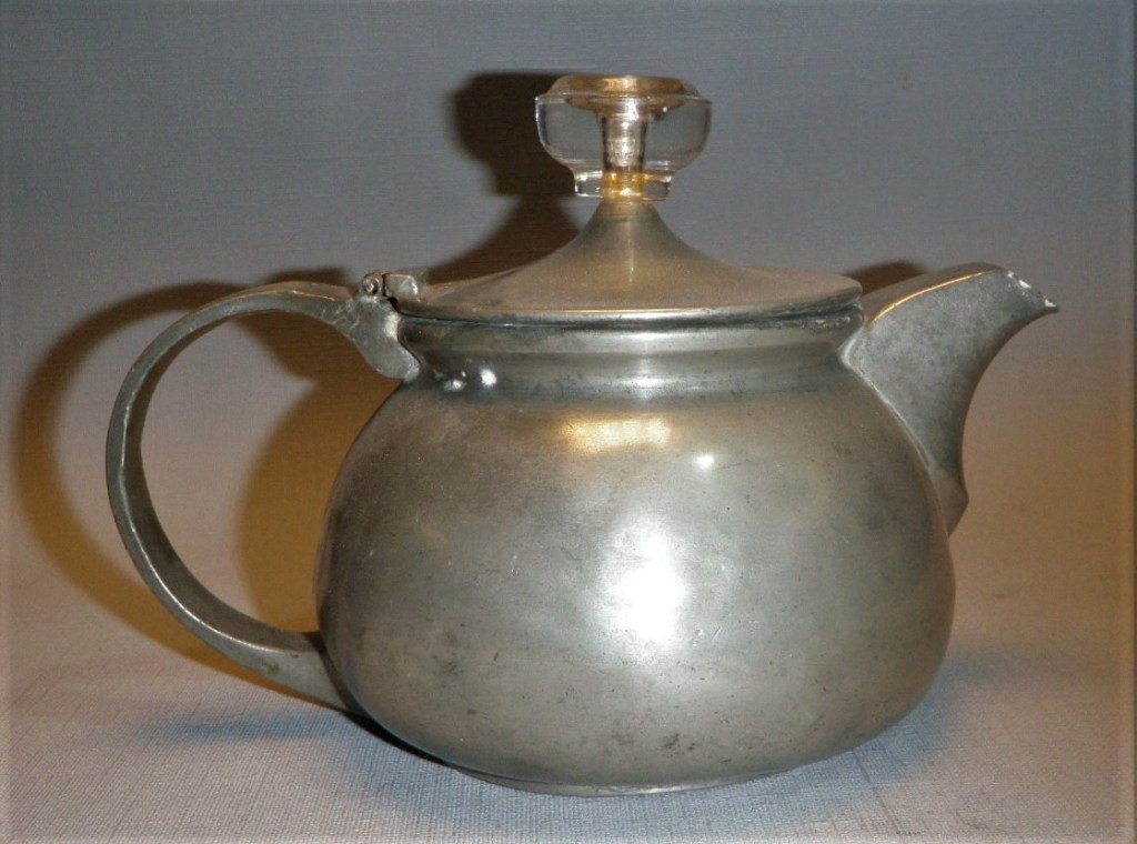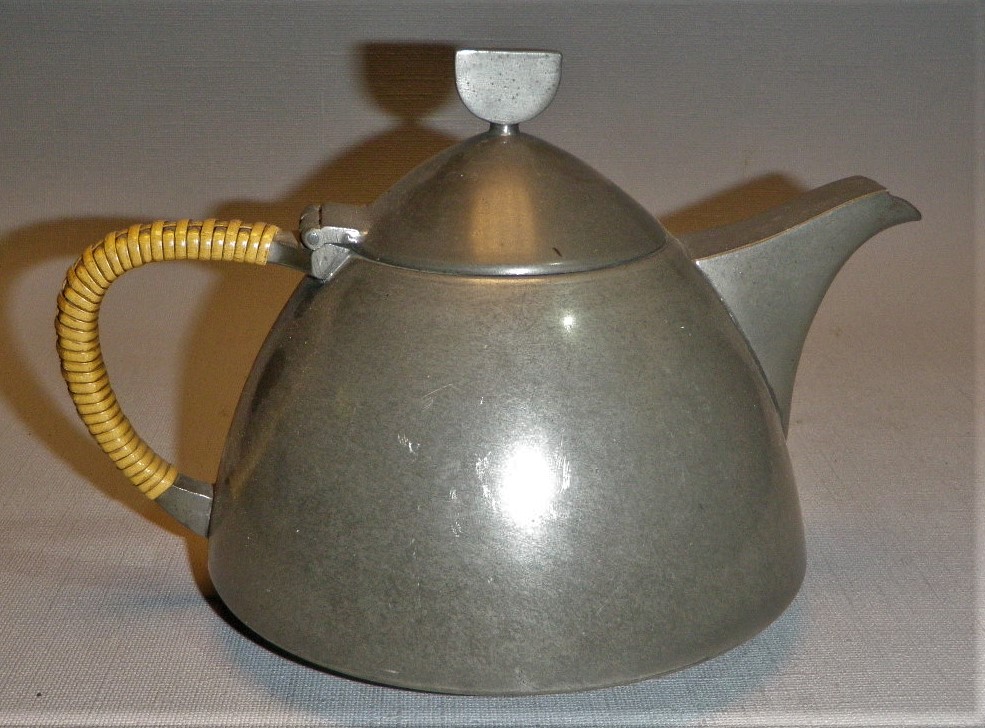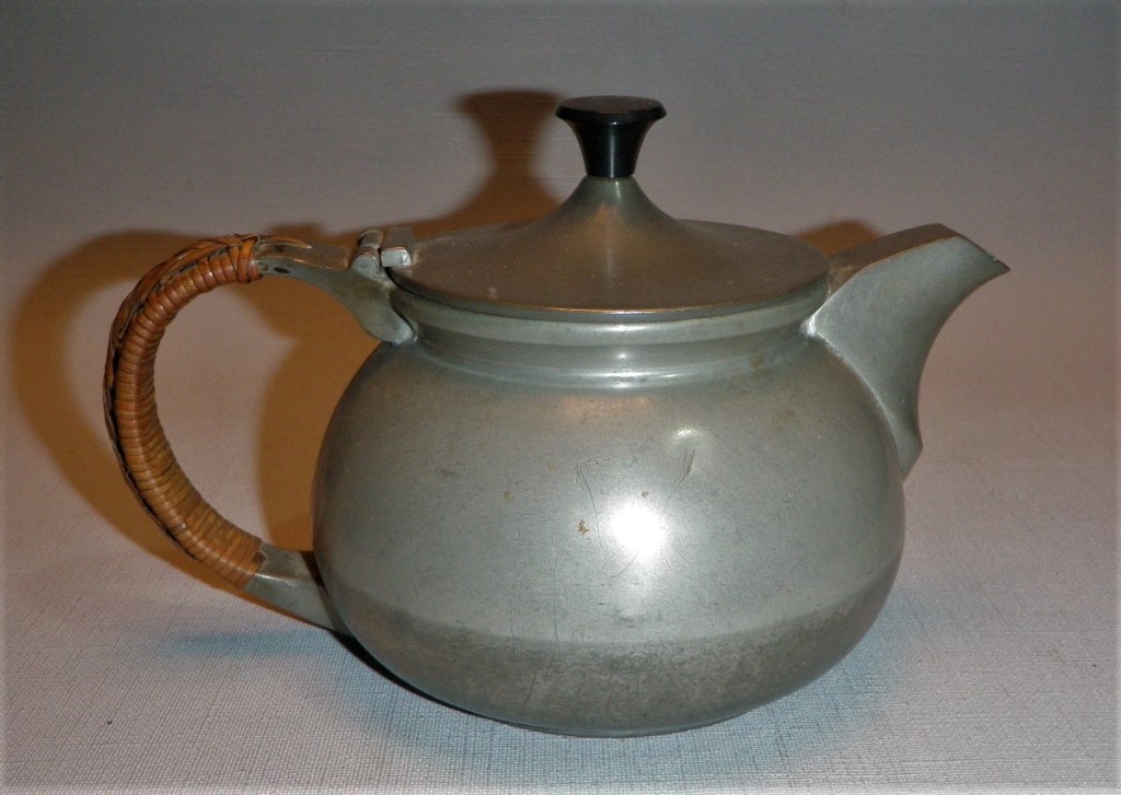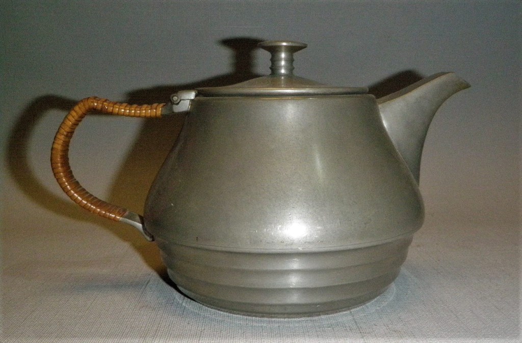 Merkteken fraaie Gero tin theepot, rotan handvat